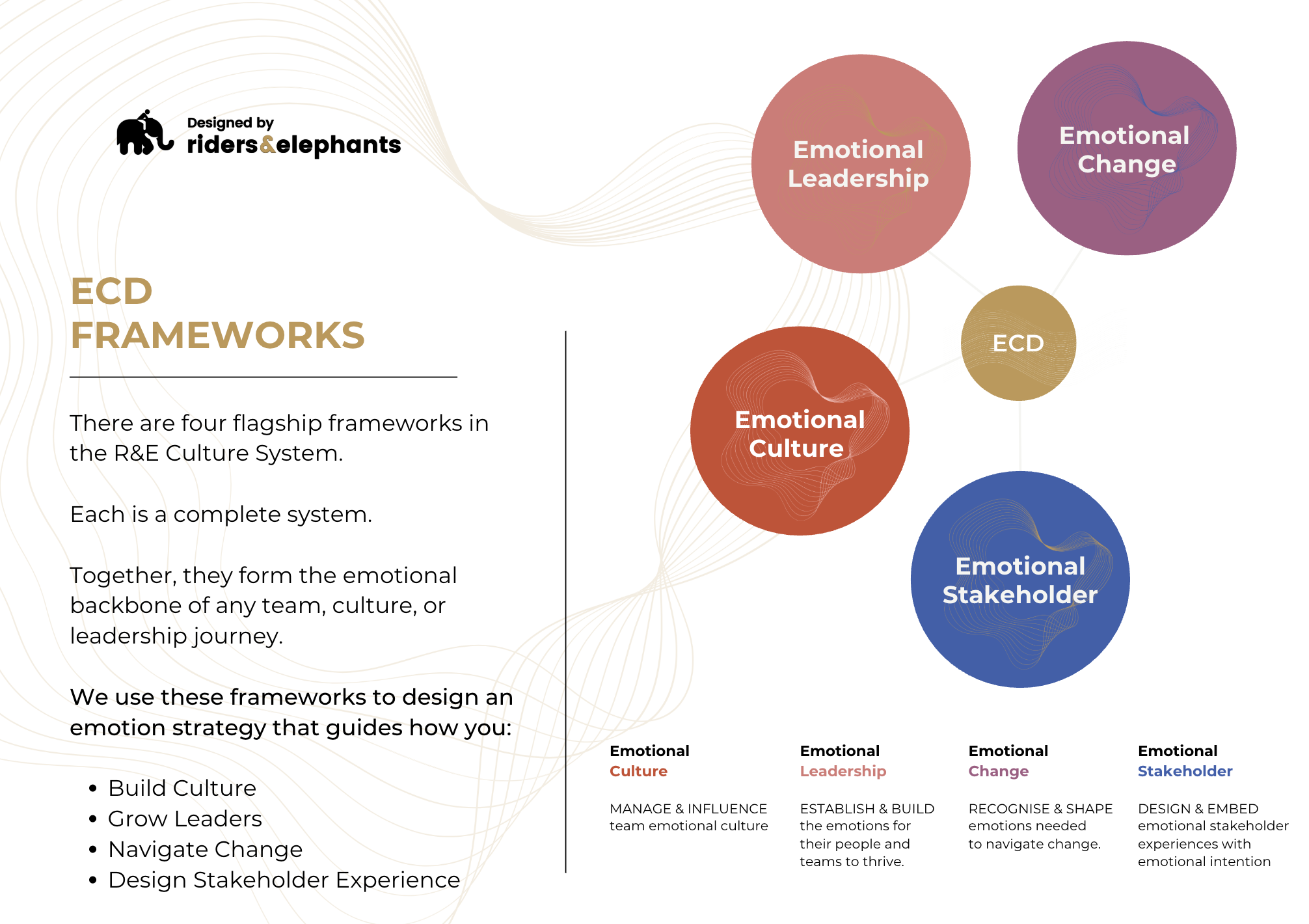 Four domains. One emotionally connected approach. The emotional backbone of culture, leadership, change, and stakeholder experience.