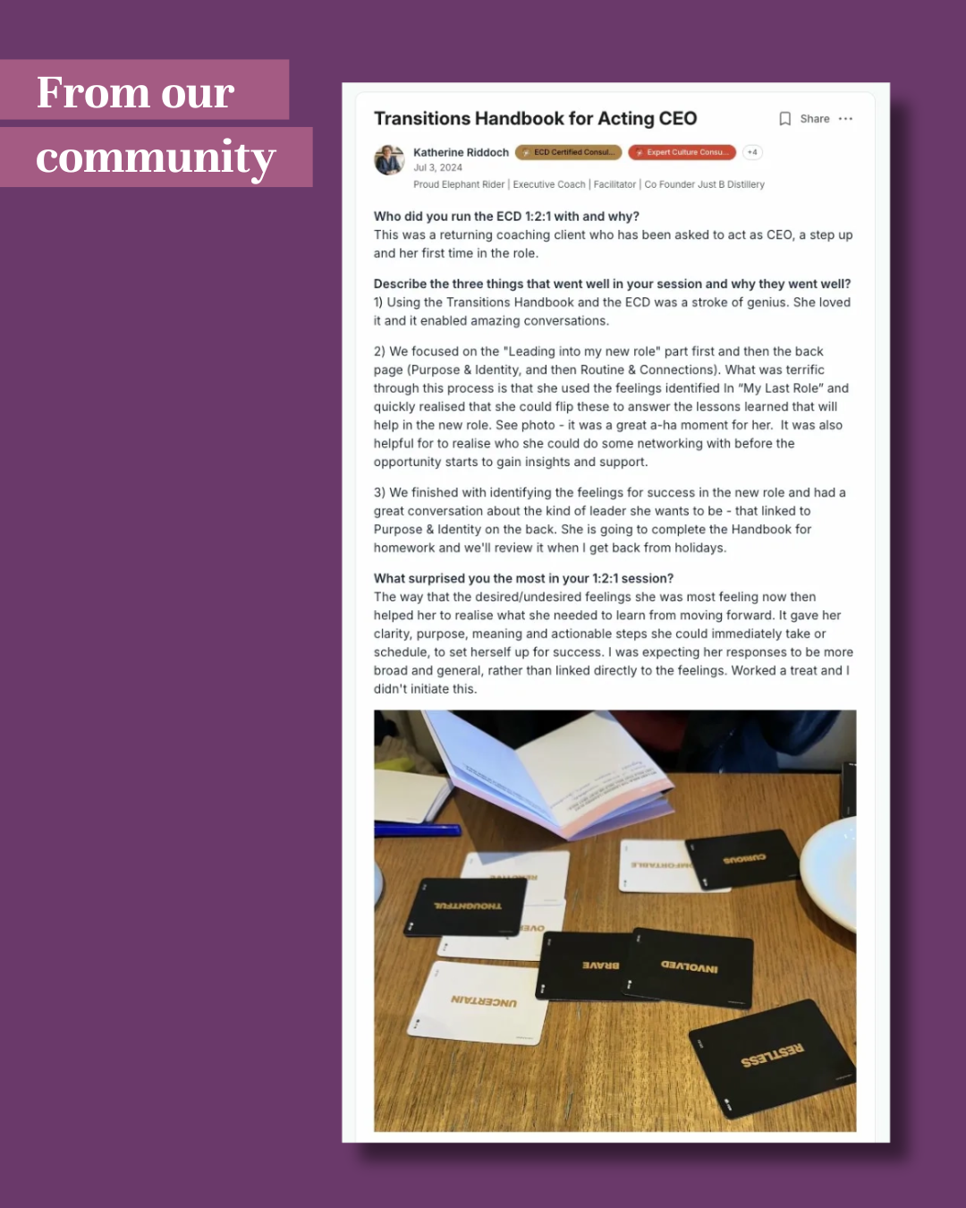 Katherine used the Transitions Handbook with a coaching client stepping into an Acting CEO role — her first time in the position. Katherine said: "Using the Transitions Handbook and the ECD was a stroke of genius. She loved it and it enabled amazing conversations."