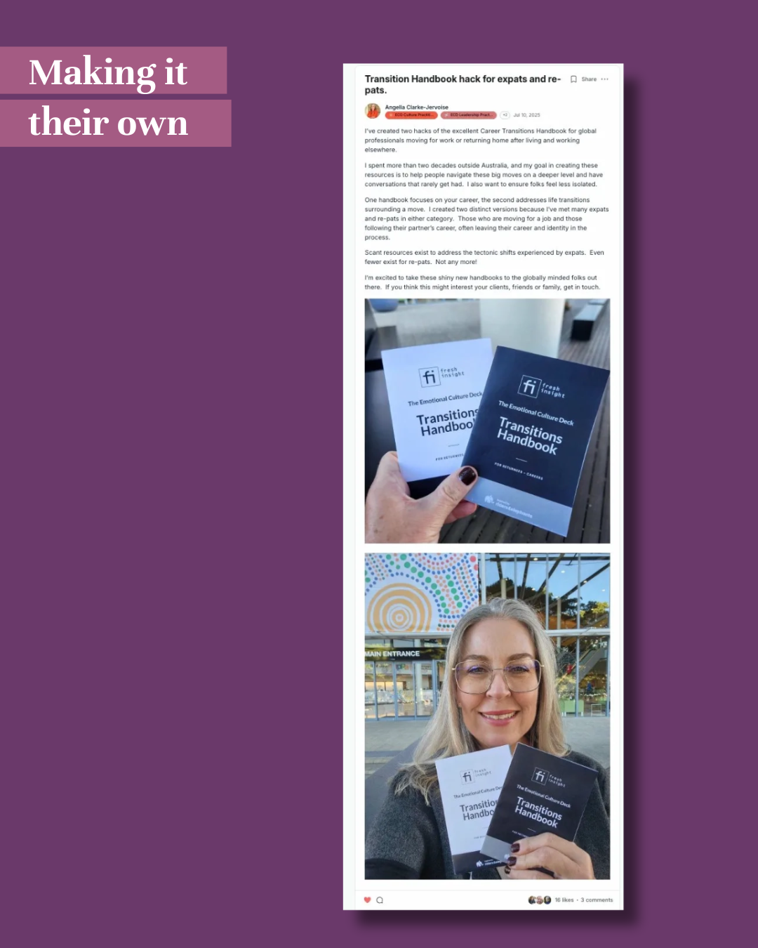 Angella created two custom versions of the Transitions Handbook for global professionals navigating moves — one for career transitions, one for life transitions surrounding a move. She said: "My goal in creating these resources is to help people navigate these big moves on a deeper level and have conversations that rarely get had."